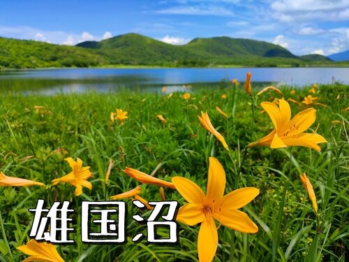 雄国沼(おぐにぬま) ・標高:約1,000m ・所在地:福島県耶麻郡北塩原村 ・例年6月中旬~7月上旬にはニッコウキスゲの花が咲き誇る ・周辺には「雄国山」や「猫魔ヶ岳」等があり、登山と併せて楽しむことができる ・国の史跡名勝天然記念物に指定されている