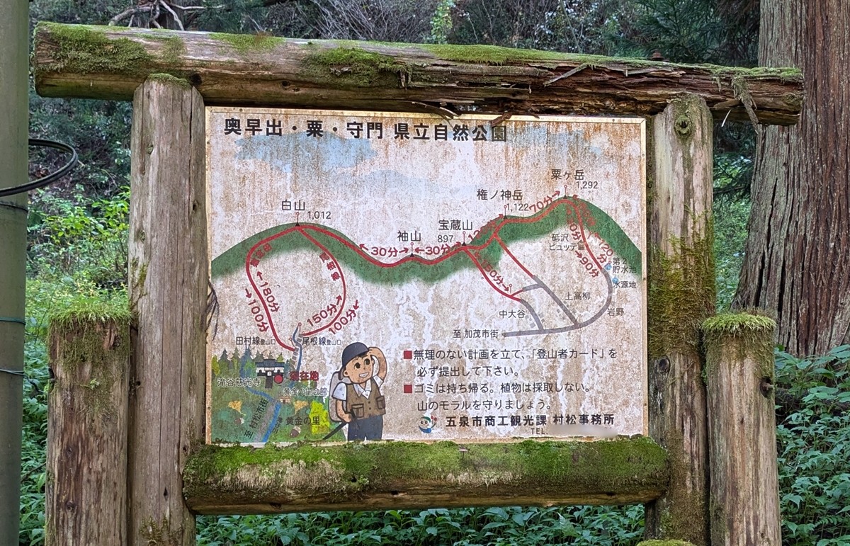 登山道の手前にある案内板。里山にはこのようなシンプルでかわいらしい案内板を時々見かけますが、意外とキツい山だったりするので要注意です(笑)