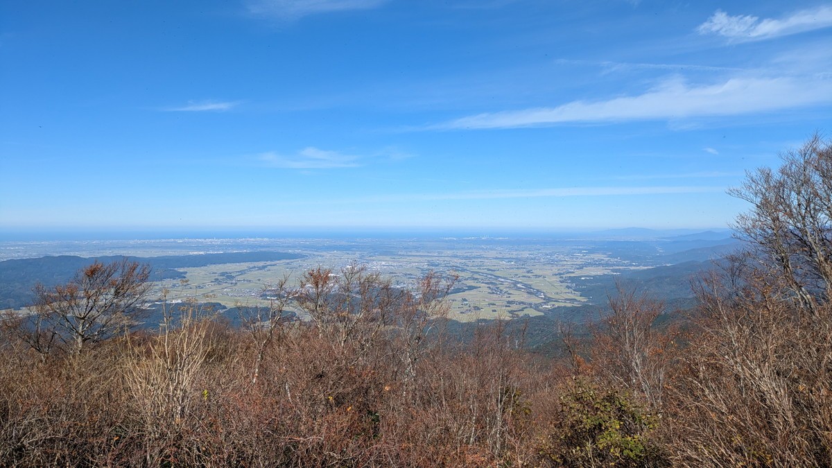 平野の奥に「弥彦山」、「角田山」などが見えました。さらにその奥に山が見えるな~と思ったら、佐渡島でした!越後白山から佐渡まで見えたのは初めてだったので驚きました。