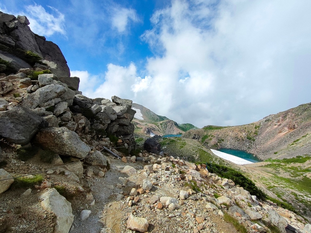 1日目の「お池巡り」ではガスが出ていたものの青空の下できれいな池を眺めることができました。池を眺めるだけでなく、アルプスのような山岳地帯の中を歩くので迫力ある景色も楽しむことができました。