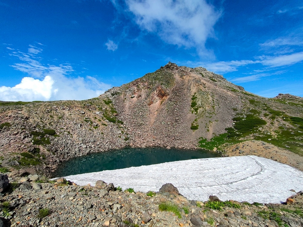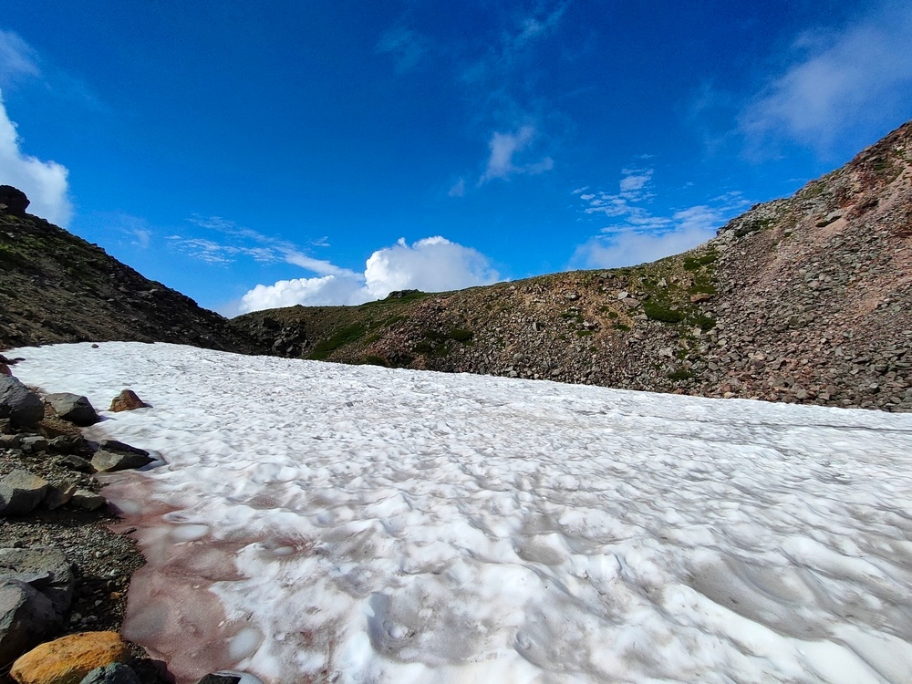 「御前峰」山頂からは見えていた「紺屋ヶ池」ですが、下りてきたら残雪でほとんど水面が見えず。
