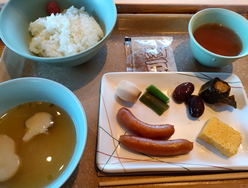 朝食。混ぜたり醤油をかけたりしなくても、そのままご飯にかけてOKな納豆パックがありました。これテント泊なんかで納豆食べたい時にいいですね。
