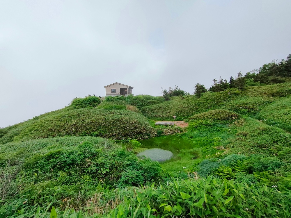 「殿ヶ池避難小屋」はこのルートで唯一の避難小屋です。「砂防新道」にある避難小屋ほど大きくありませんが、しっかりとした造りの良い小屋でした。手前にはテーブルとベンチもあります。ガスガスだったのが残念で、天気が良ければ眺望も良さそうな場所でした。
