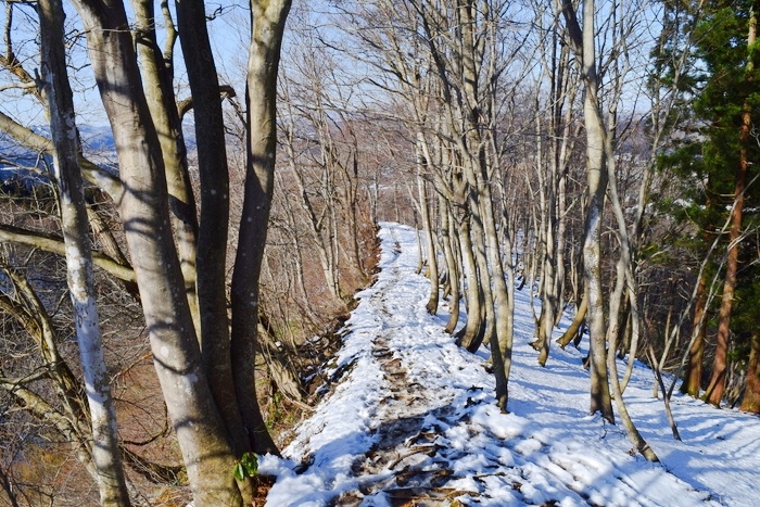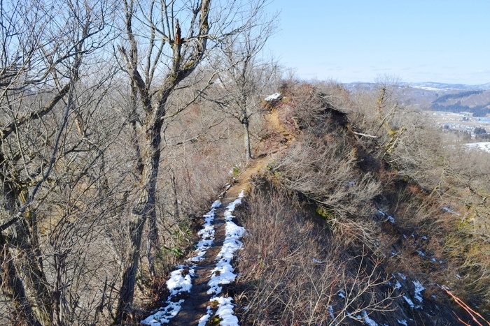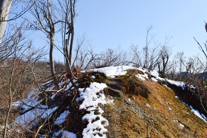 「山城跡」手前の階段。左側の斜面が崩れ落ちているので、右側を巻いて行くように道が続いています。滑って落っこちてしまわないように慎重に歩きます。積雪が多くてルートが見えない時は特に要注意の箇所です。