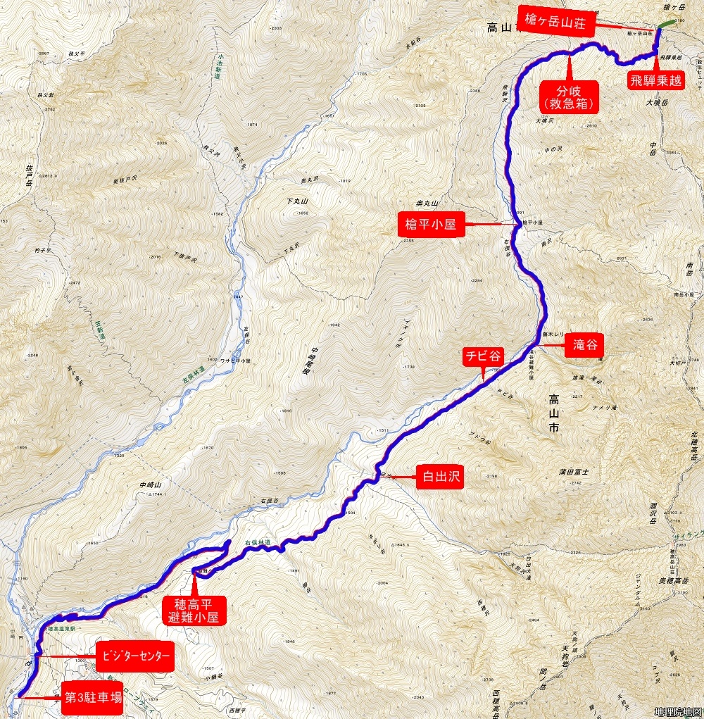 (1日目)第3駐車場 ⇒ 新穂高ビジターセンター ⇒ 穂高平避難小屋 ⇒ 槍平小屋 ⇒ 飛騨乗越 ⇒ 槍ヶ岳山荘 ⇔ 槍ヶ岳山頂