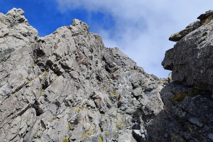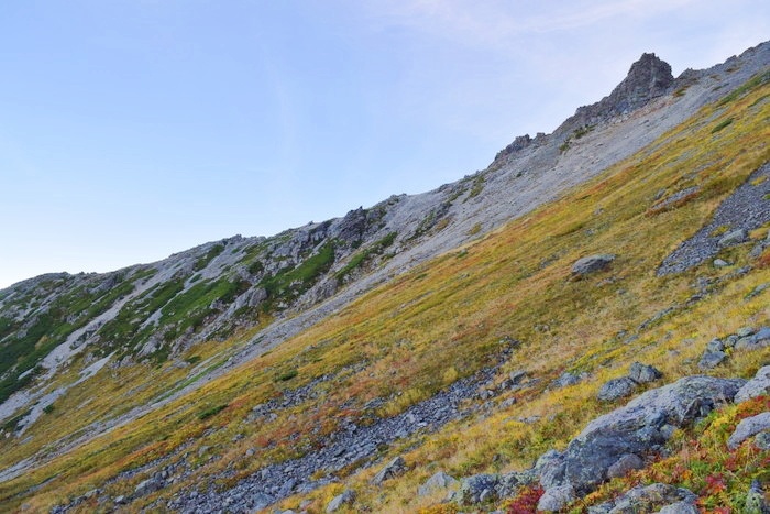 トレースとペンキ印、岩の形状を確認しながら登って行きます。上からの落石に注意するのと、自身も石を落とさないように登りましょう。実際、この日も落石が発生して、危うく人に当たりそうになっていました。