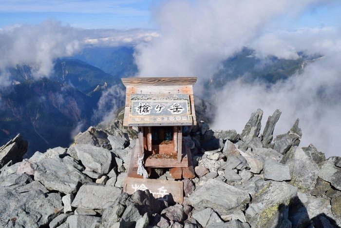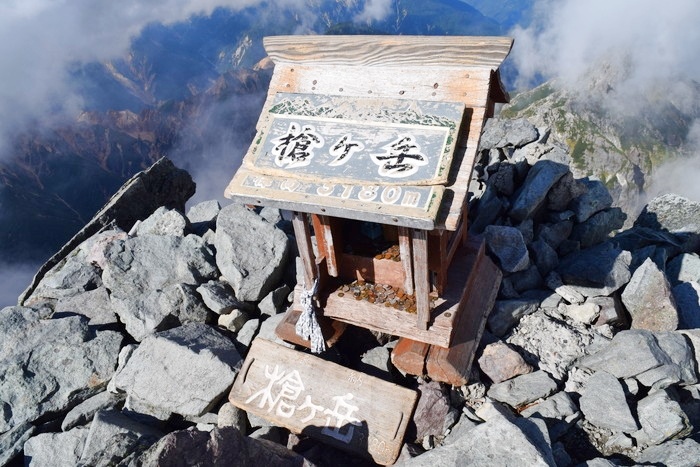 槍ヶ岳山頂に到着!標高3,180mです。山頂には祠と標識があります。標識(板状)は手で持つことができます。