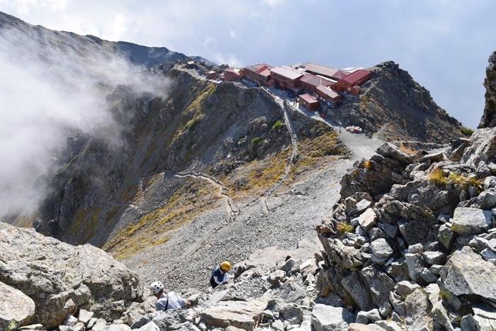 山荘の部屋に荷物を置いてヘルメット装着。カメラと貴重品だけ持って山頂アタックです。