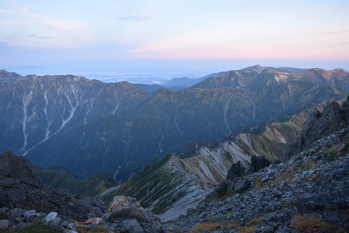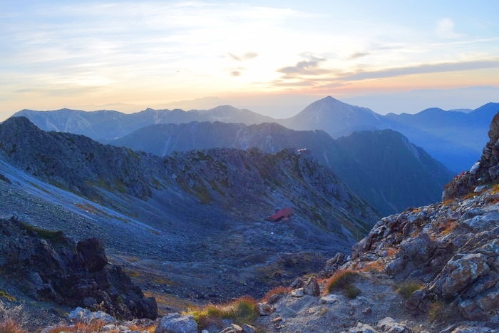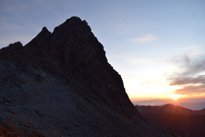 槍ヶ岳のアーベントロート。夕食に呼ばれた人達が山荘の中へ消えてきました。山荘の食事もそそられるのですが、素泊まりにすると食事時間を気にせず過ごせて良いです。もちろん節約のためでもありますけど。